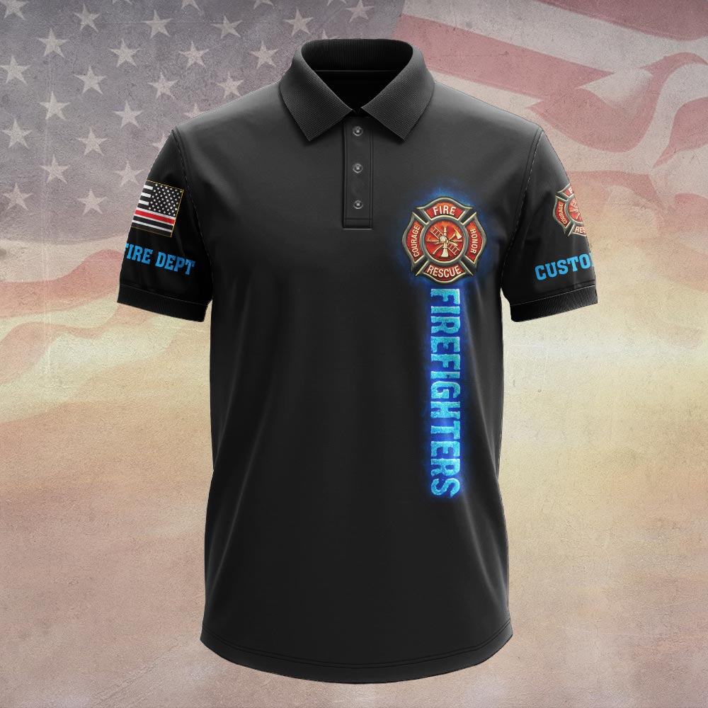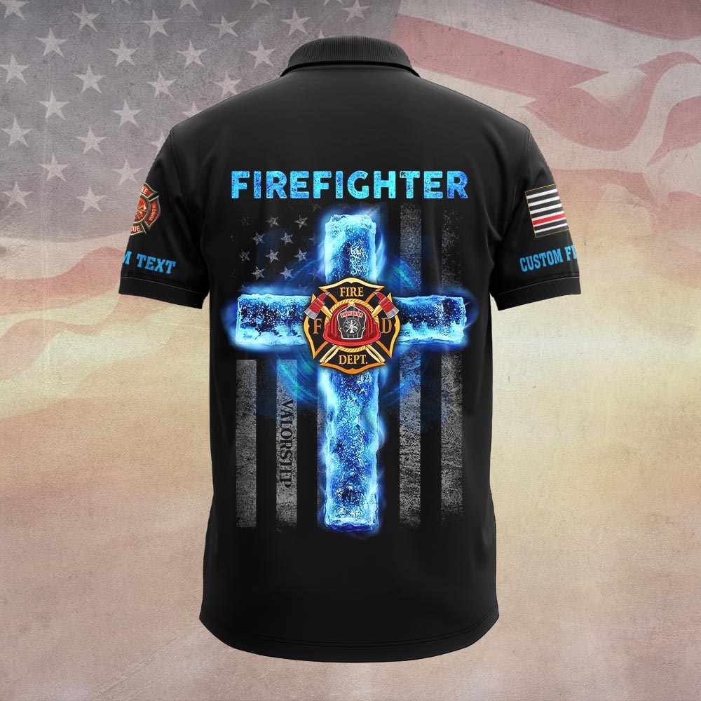 Custom Dept & Text Firefighter’s Faith – Blue Flame Cross Edition #DQH0084 – Polo