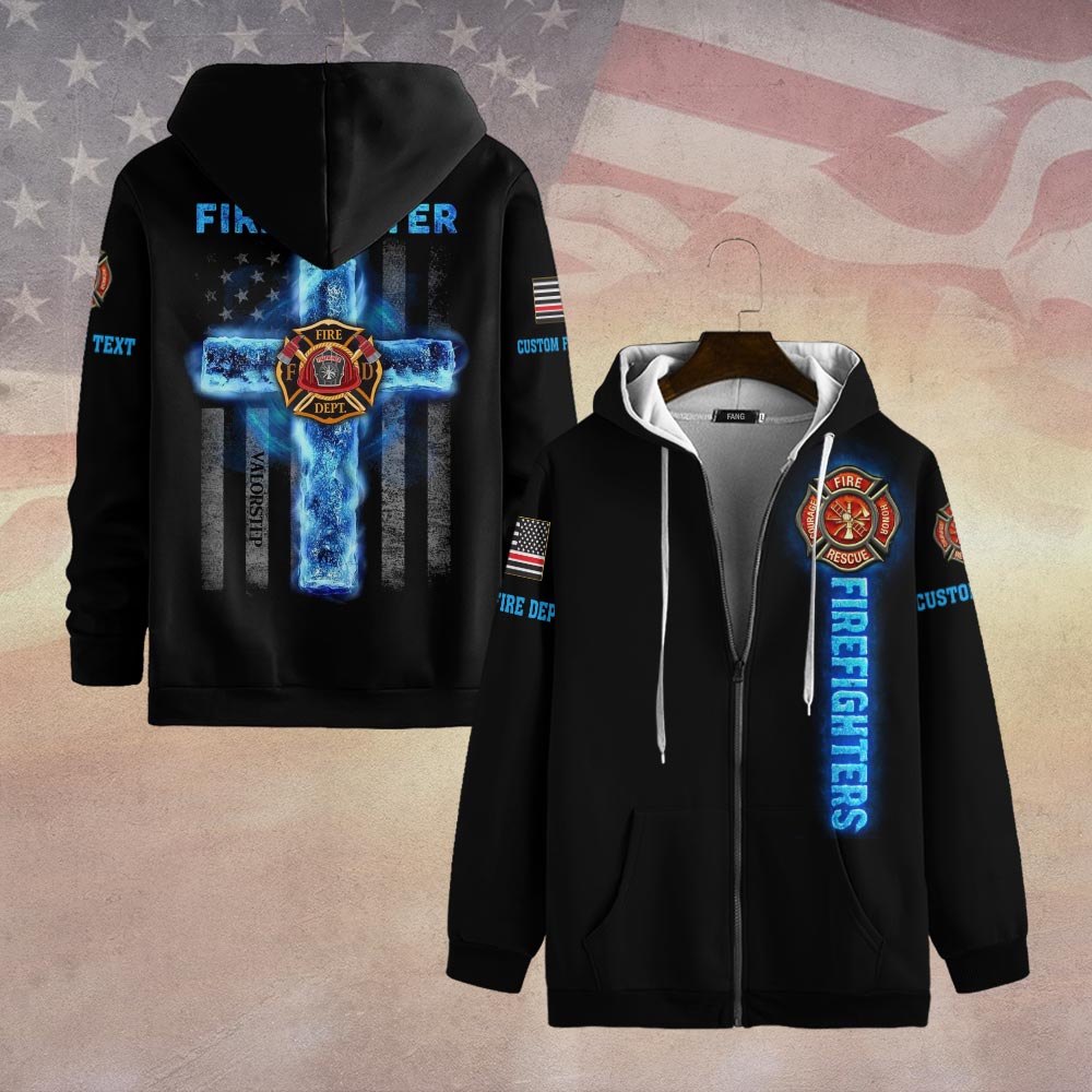 Custom Dept & Text Firefighter’s Faith – Blue Flame Cross Edition #DQH0084 – Zip Hoodie