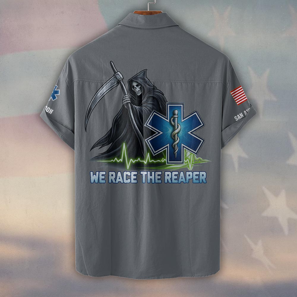 Custom Name & Department EMS We Race The Reaper First Responder #DQH0529 – Short Sleeve Button Shirt