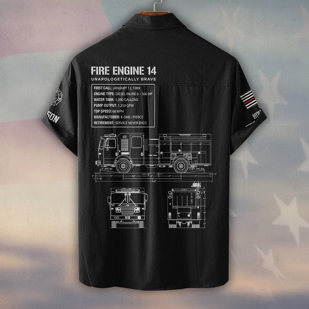 Custom Name & Department Fire Engine Blueprint – Unapologetically Brave #DQH0375 – Short Sleeve Button Shirt