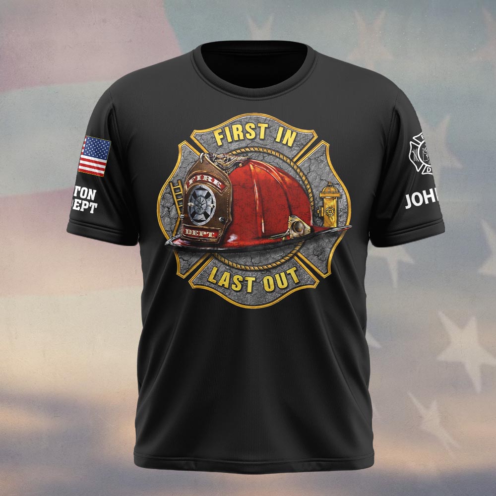 Custom Name & Department First In Last Out Brotherhood Firefighter #DQH0645 – T-shirt