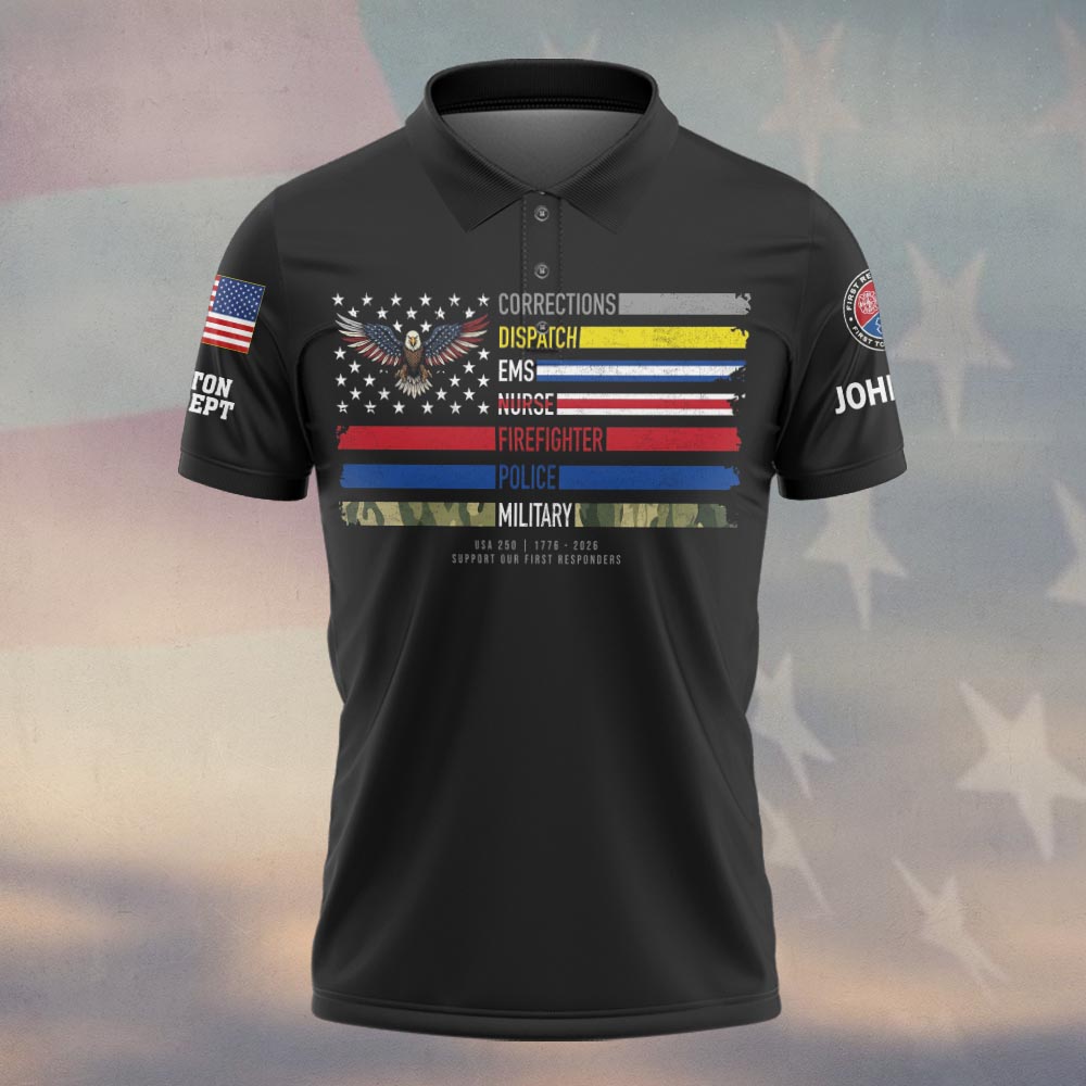 Custom Name & Department First Responders Flag America Eagle Support Our Hometown Heroes #DQH0642 – Polo