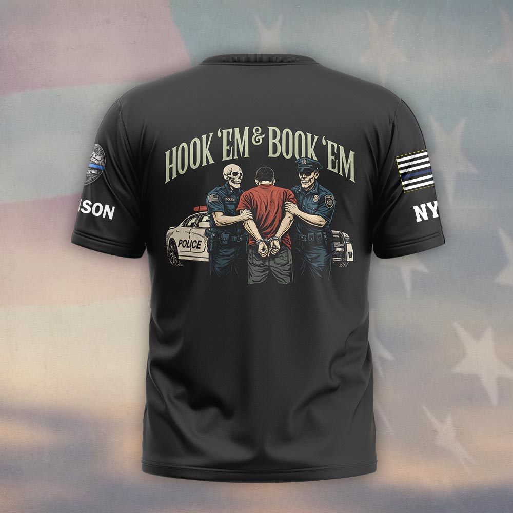 Custom Name & Department Hook ’Em & Book ’Em – Law Enforcement Edition #DQH0519 – T-shirt
