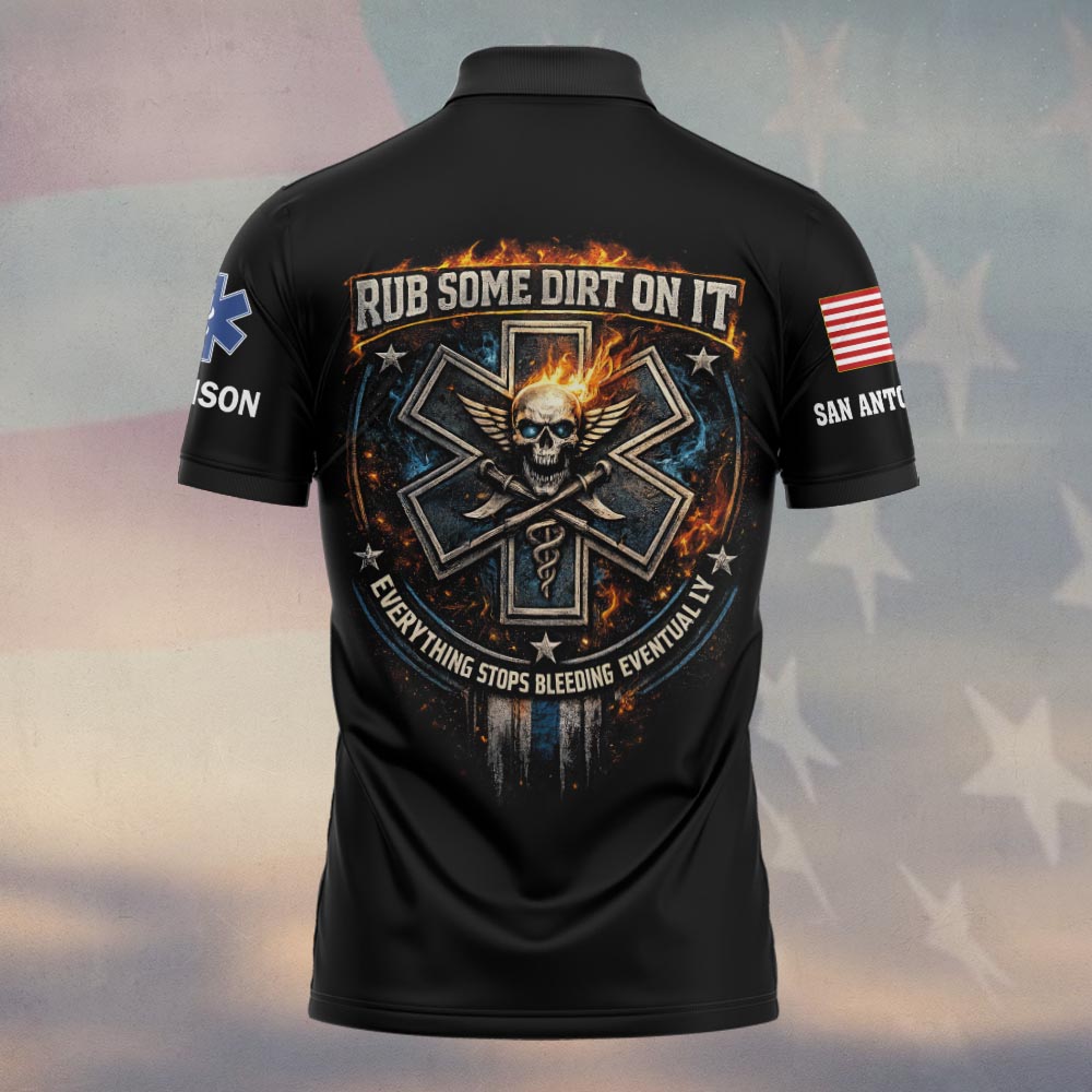 Custom Name & Department Rub Some Dirt On It Everything Stops Bleeding EMS First Responders #DQH0527 – Polo