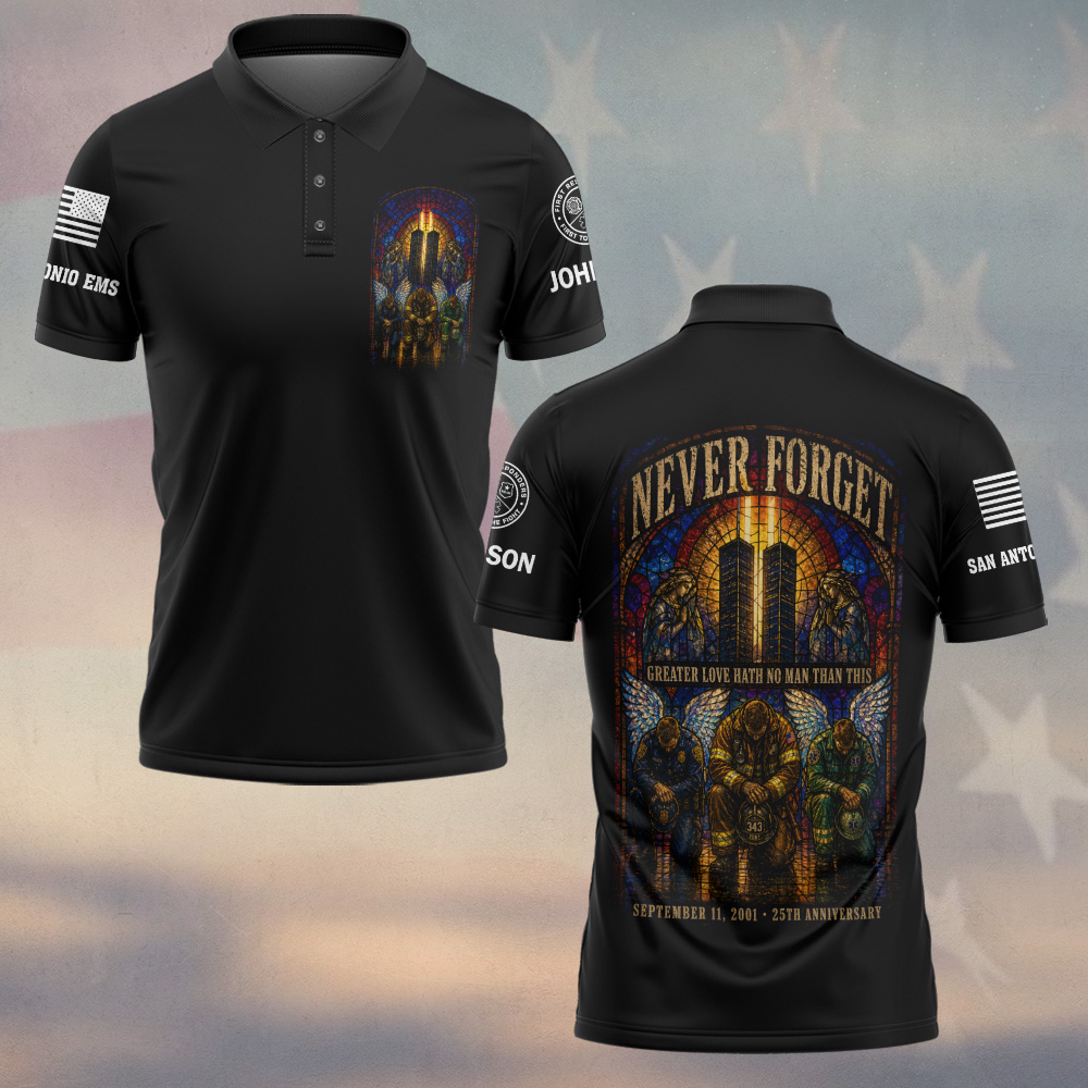 Custom Name & Department September 11 25th Anniversary Greater Love Hath No Man Than This First Responders #DQH0666 – Polo