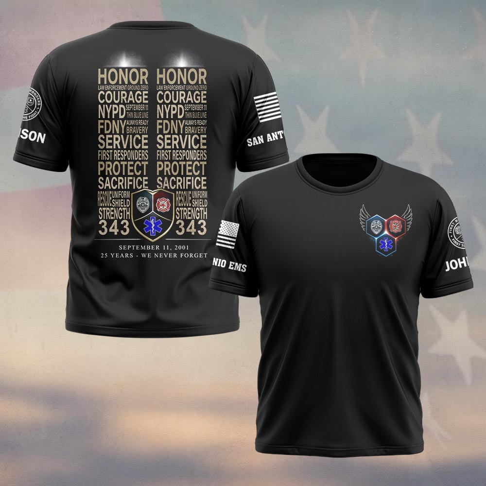 Custom Name & Department September 11 25th Anniversary Twin Towers Text Of Honor #DQH0656 – T-shirt