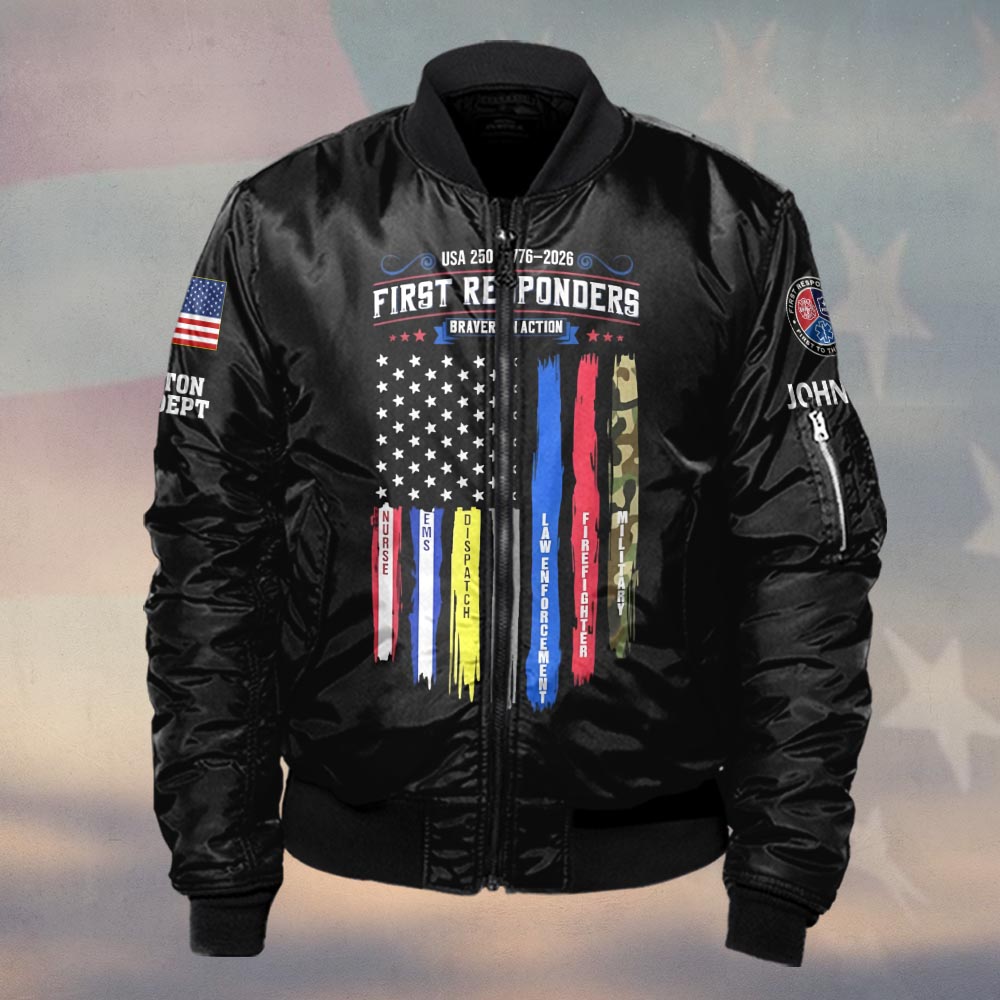 Custom Name & Department USA 250 First Responders Bavery In Action #DQH0444 – Bomber Jacket