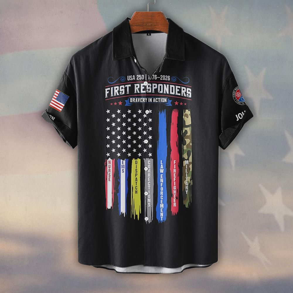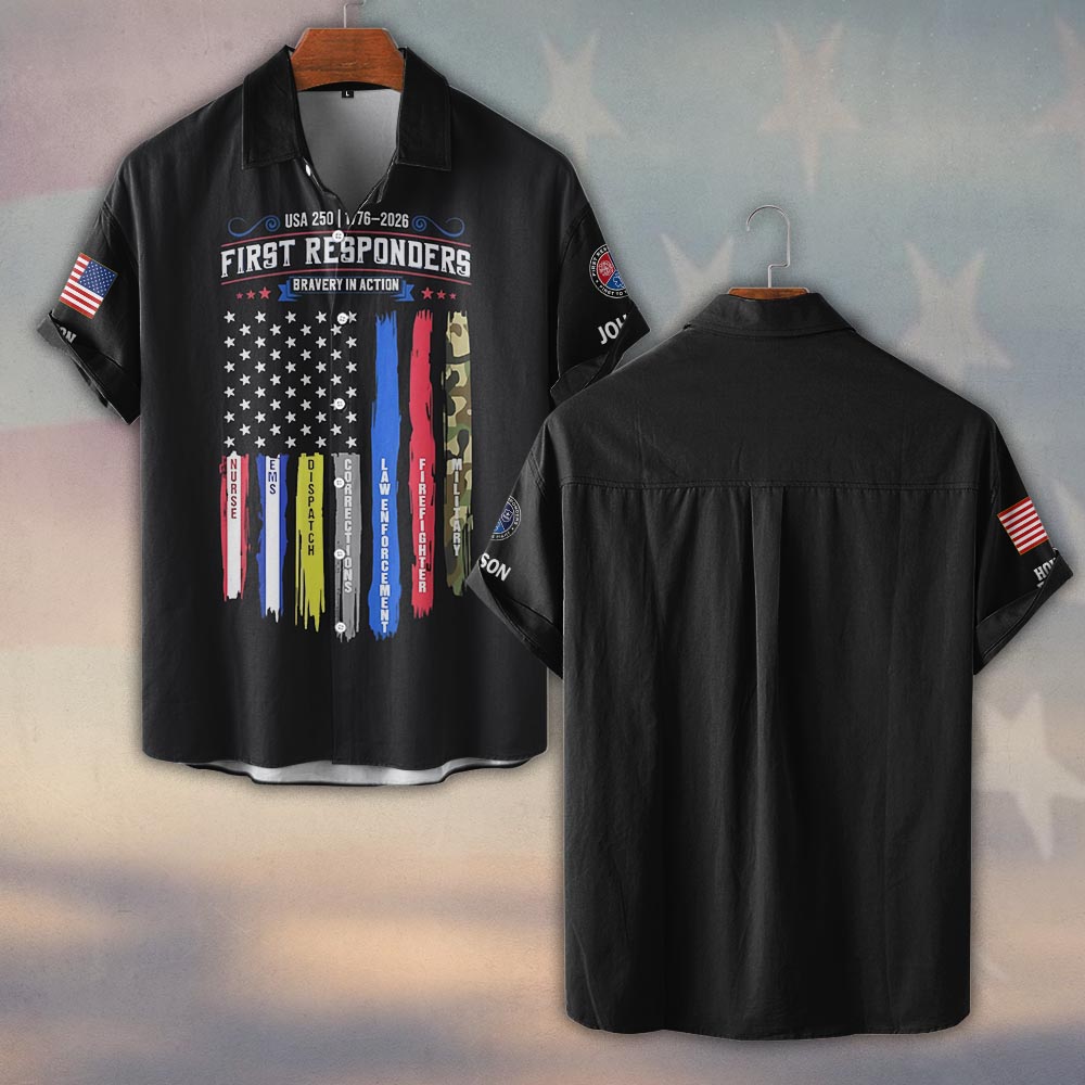 Custom Name & Department USA 250 First Responders Bavery In Action #DQH0444 – Short Sleeve Button Shirt