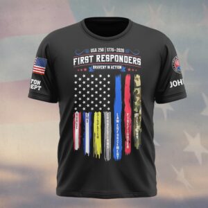 Custom Name & Department USA 250 First Responders Bavery In Action #DQH0444 – T-shirt