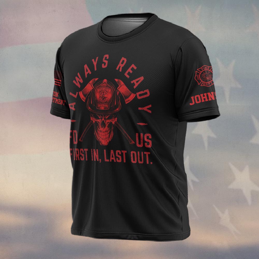 Custom Name & Fire Department Always Ready – First In, Last Out Firefighter #DQH0375 – T-shirt