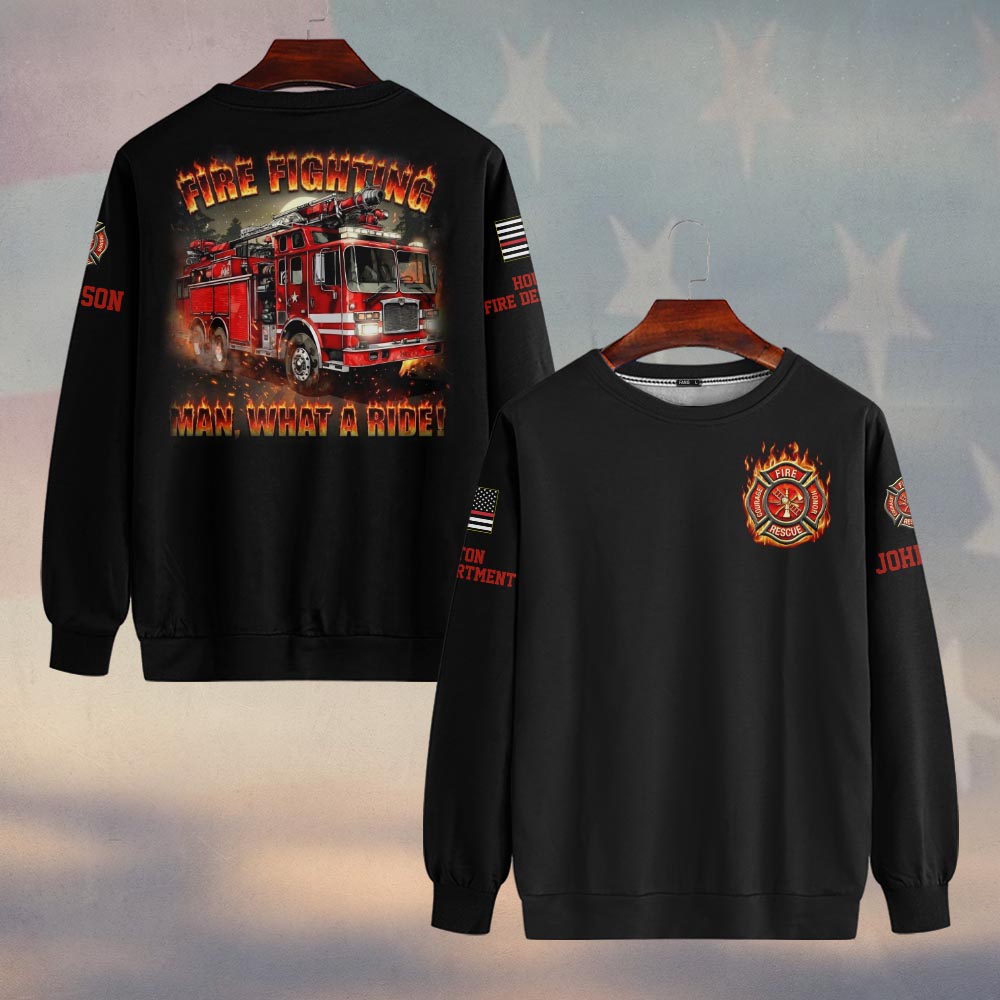 Custom Name & Fire Department Firefighting Man What A Ride #DQH0373 – Sweatshirt
