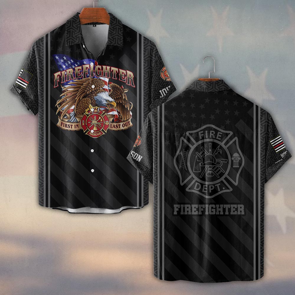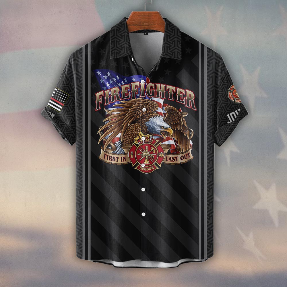 Custom Name & Fire Department First In Last Out Eagle Firefighter #DQH0356 – Short Sleeve Button Shirt