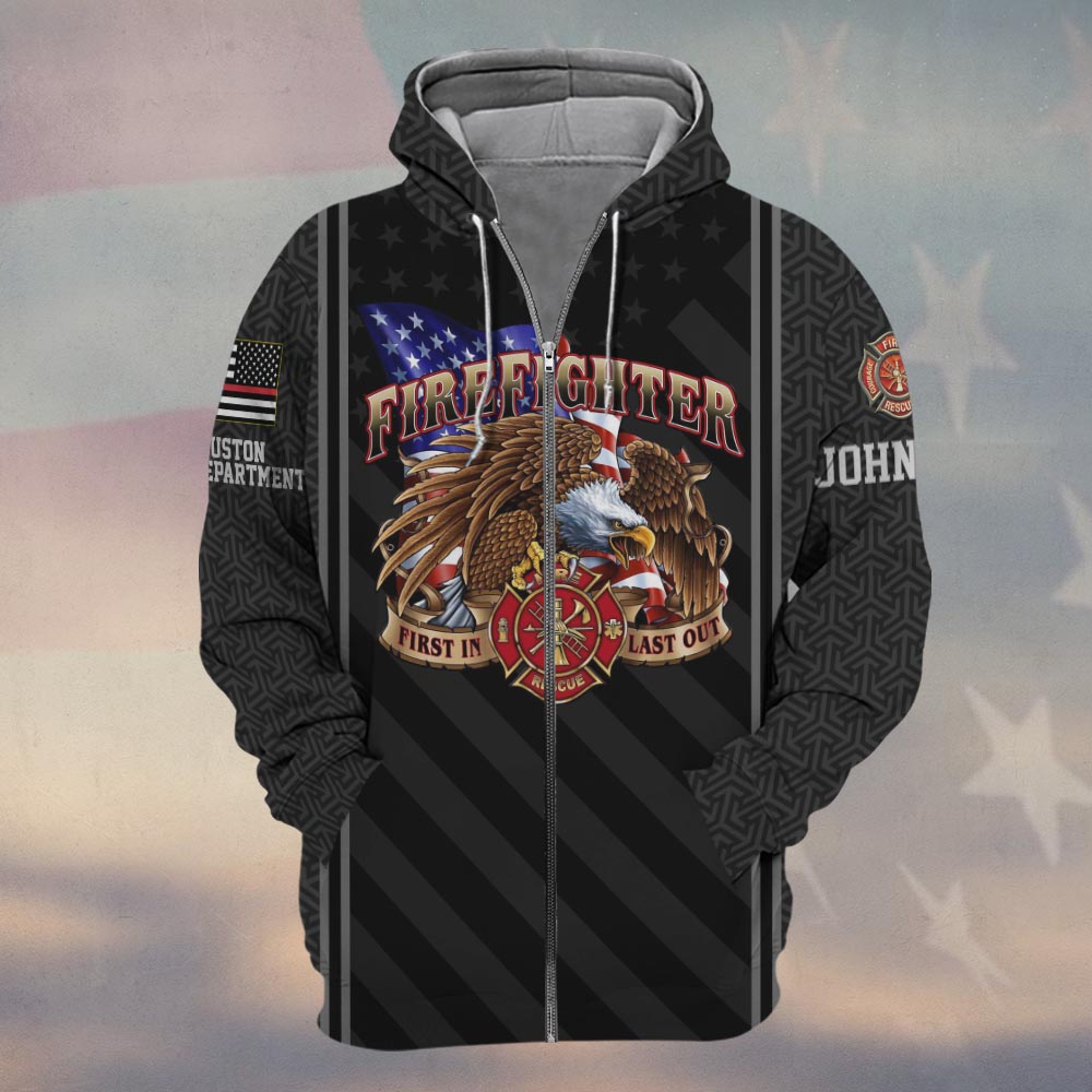 Custom Name & Fire Department First In Last Out Eagle Firefighter #DQH0356 – Zip Hoodie
