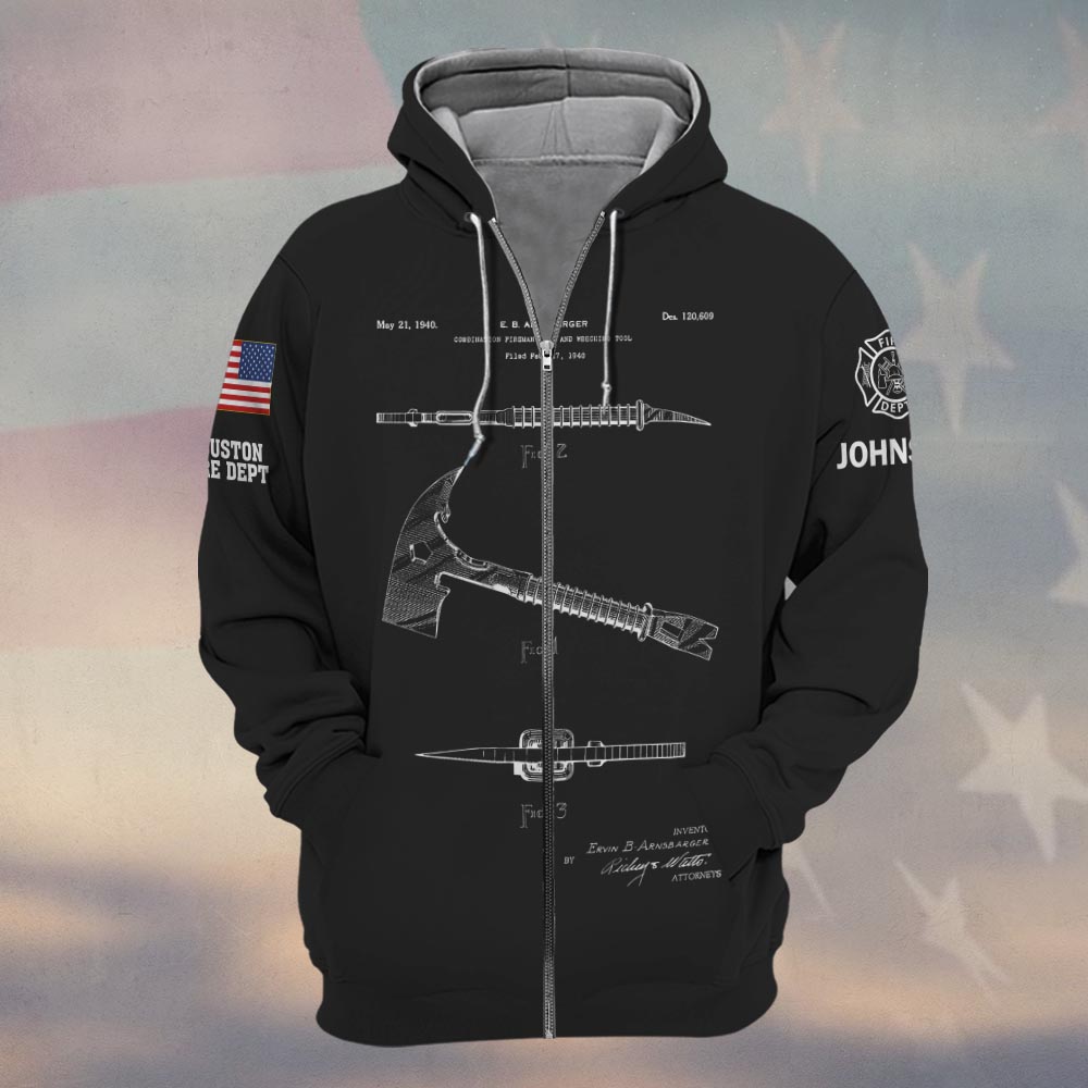 Custom Name & Fire Department Hook & Axe Blueprint Firefighter #DQH0422 – Zip Hoodie
