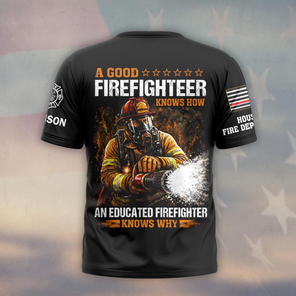 Custom Name & Fire Dept A Good Firefighter Knows How An Educated Firefighter Knows Why #DQH0394 – T-shirt