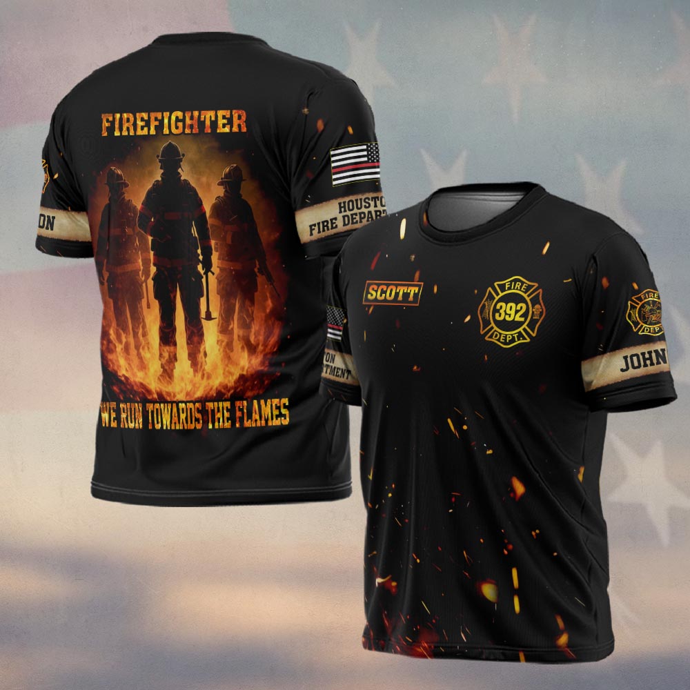 Custom Name, Number & Dept Firefighter Flames Division – We Run Toward The Fire #DQH0291 – T-shirt