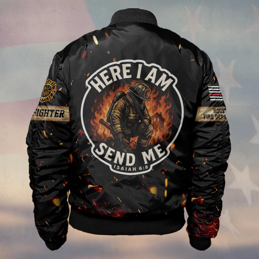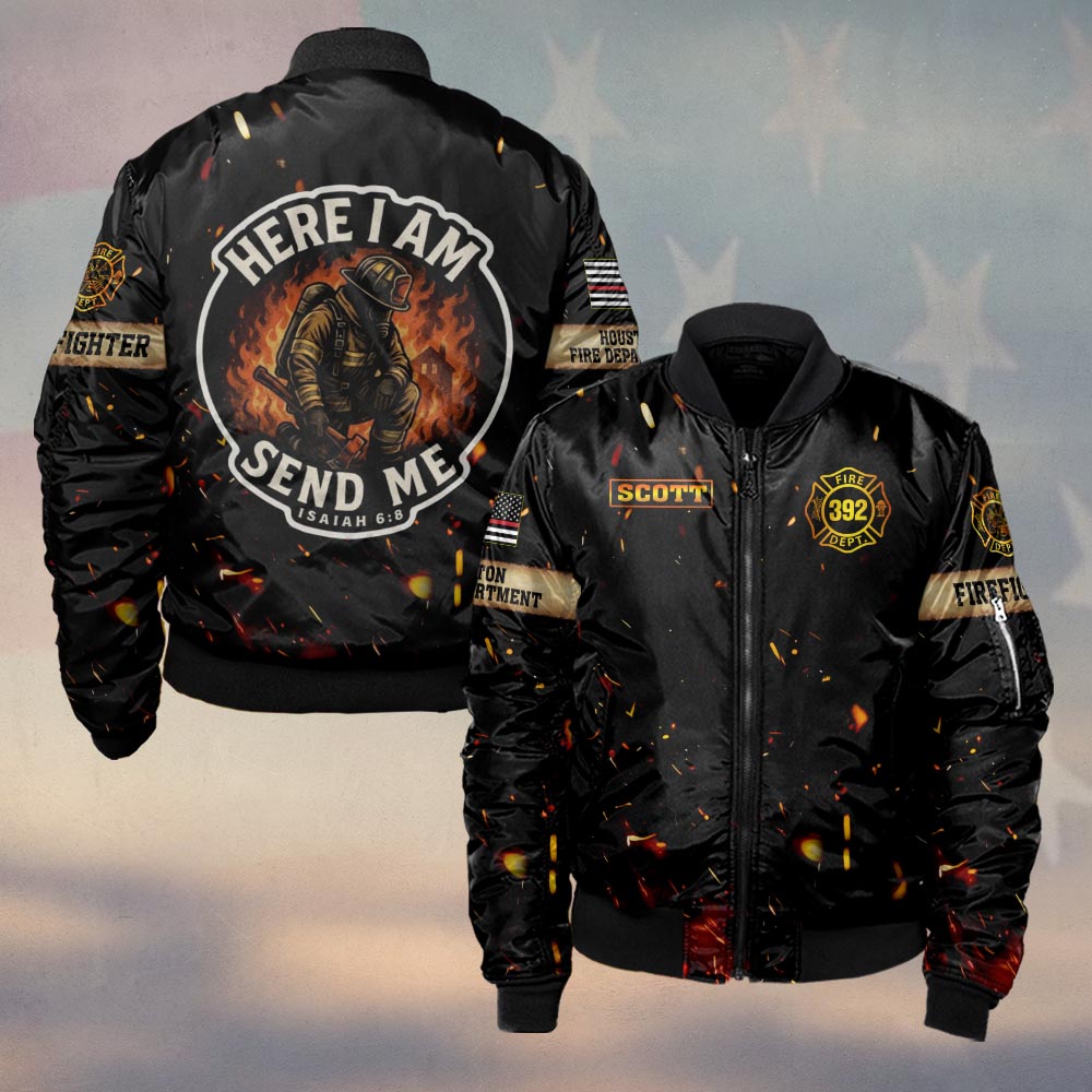 Custom Name & Number & Fire Department Here I Am, Send Me Isaiah 6:8 #DQH0372 – Bomber Jacket