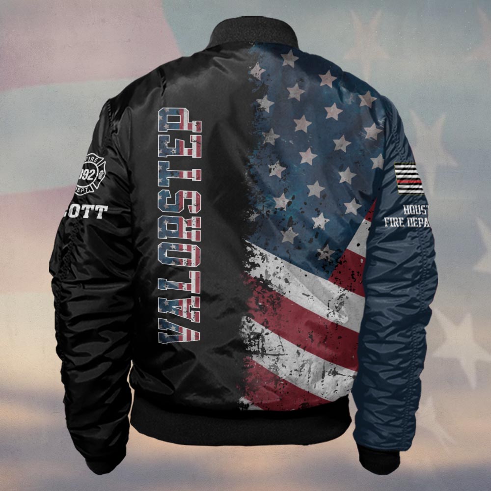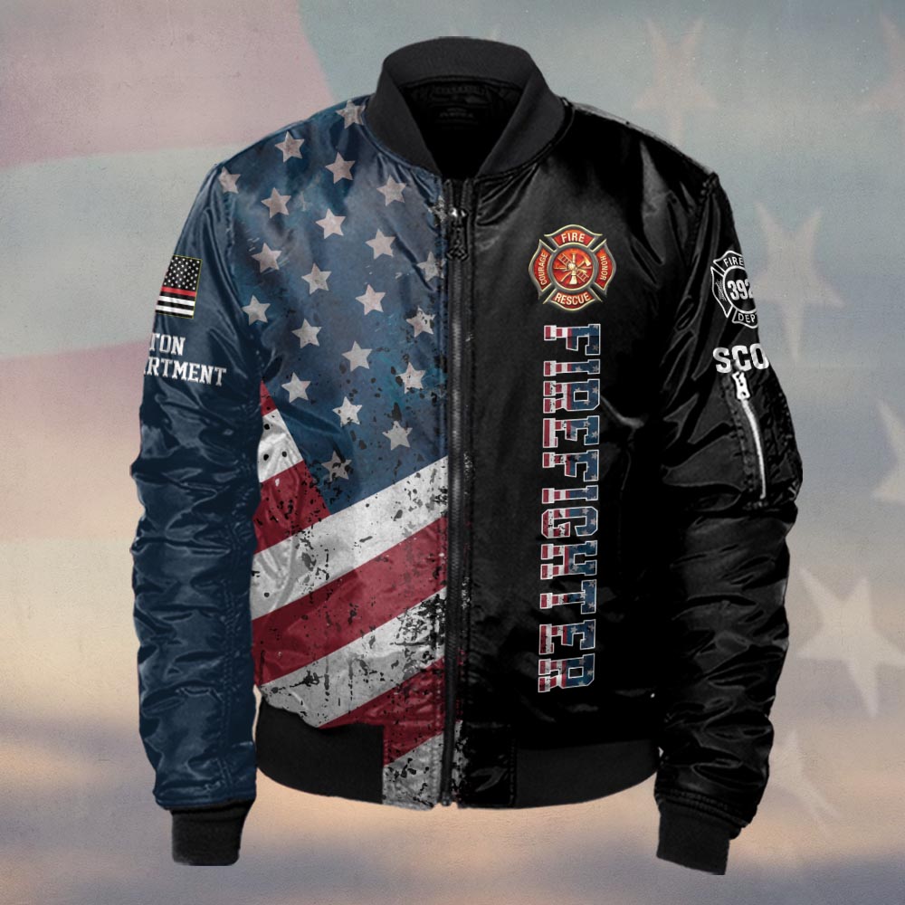 Custom Name, Number & Fire Dept American Flag Split Grunge Firefighter #DQH0282 – Bomber Jacket