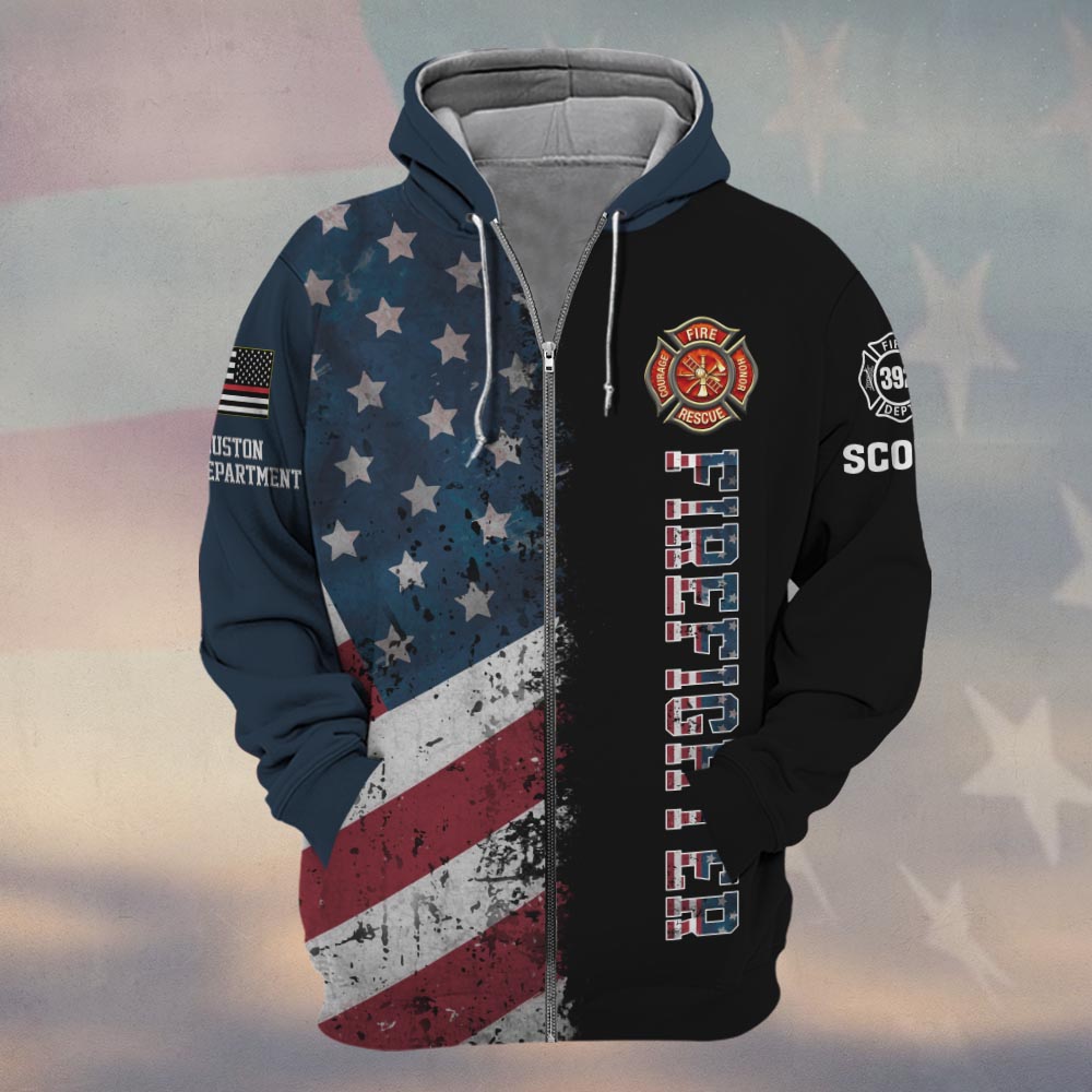 Custom Name, Number & Fire Dept American Flag Split Grunge Firefighter #DQH0282 – Zip Hoodie