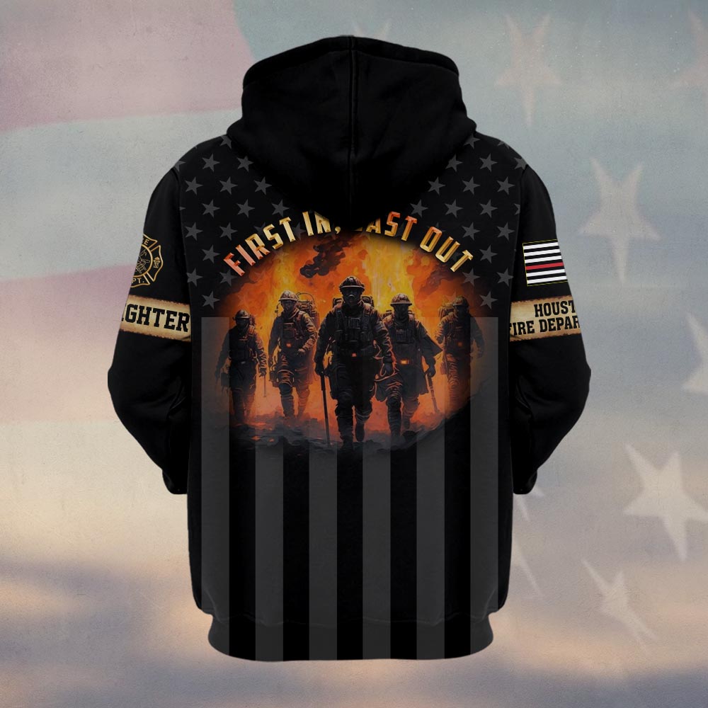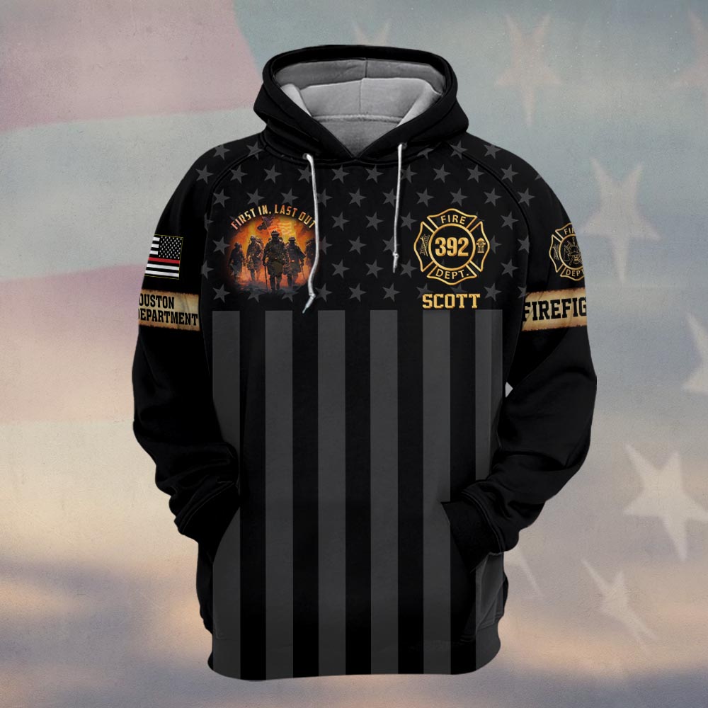 Custom Name, Number & Fire Dept First In – Last Out Shadow Honor Firefighter Jersey #DQH0286 – Hoodie