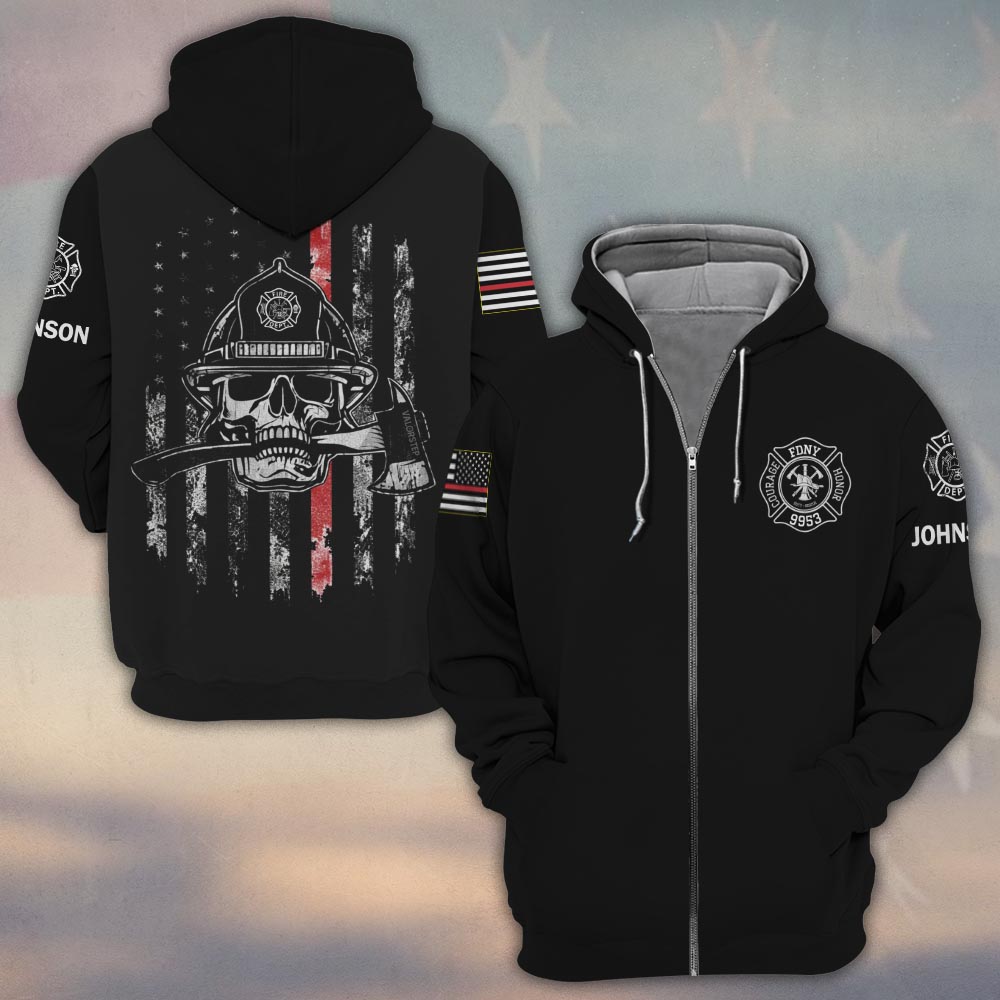 Custom Name Skull & Axe Thin Red Line Firefighter #DQH0209 – Zip Hoodie