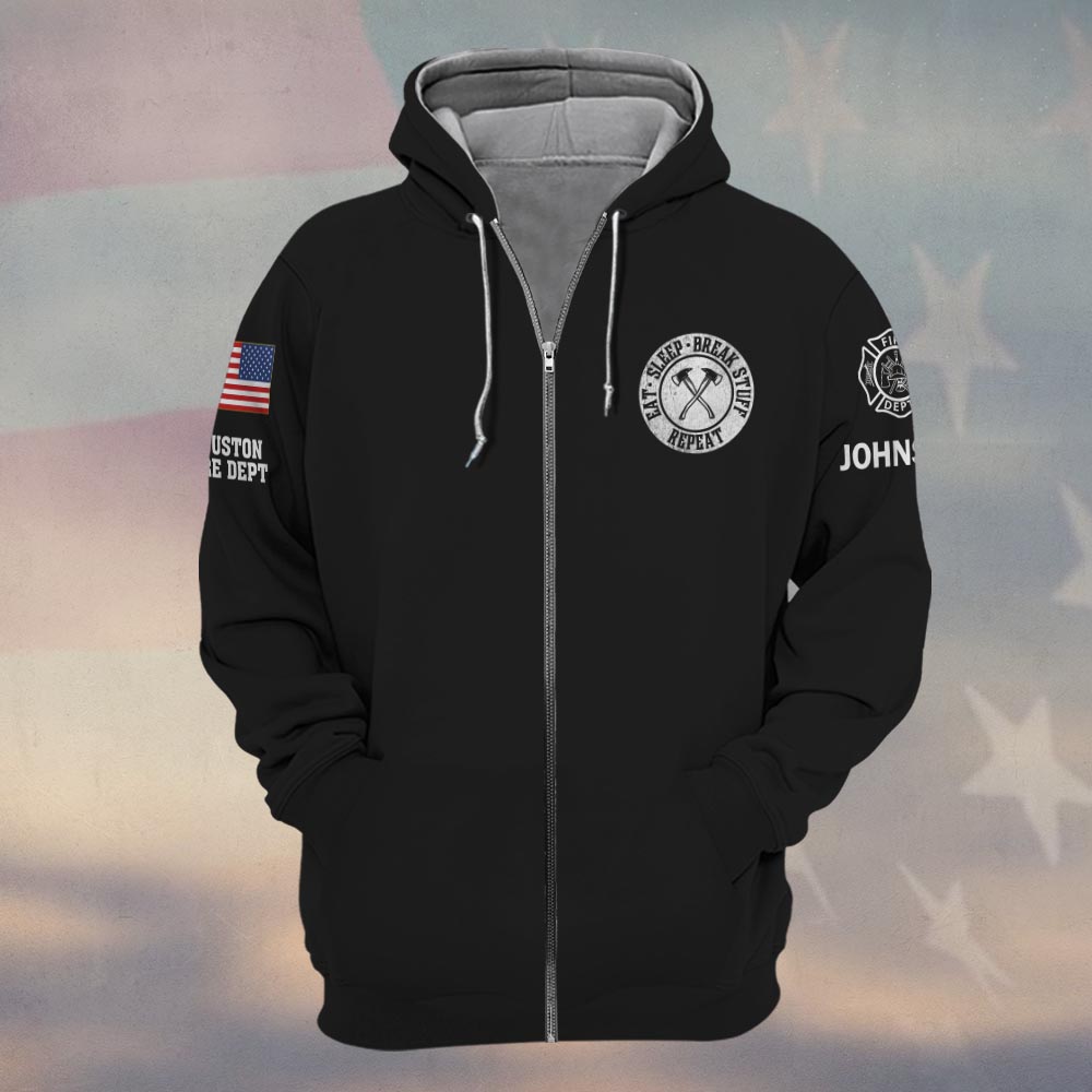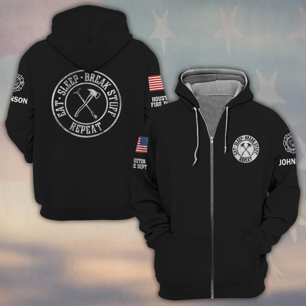 Custom Name & Text Eat Sleep Break Stuff Repeat Firefighter #DQH0415 – Zip Hoodie