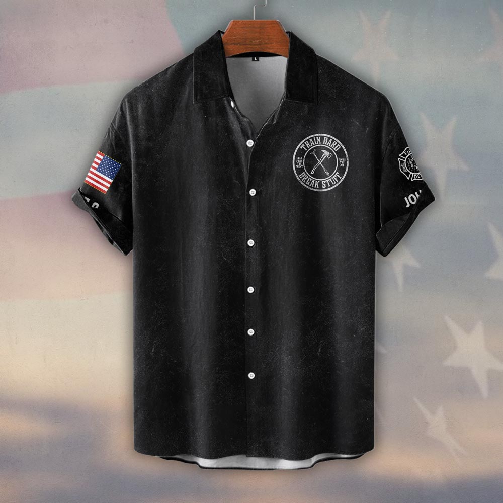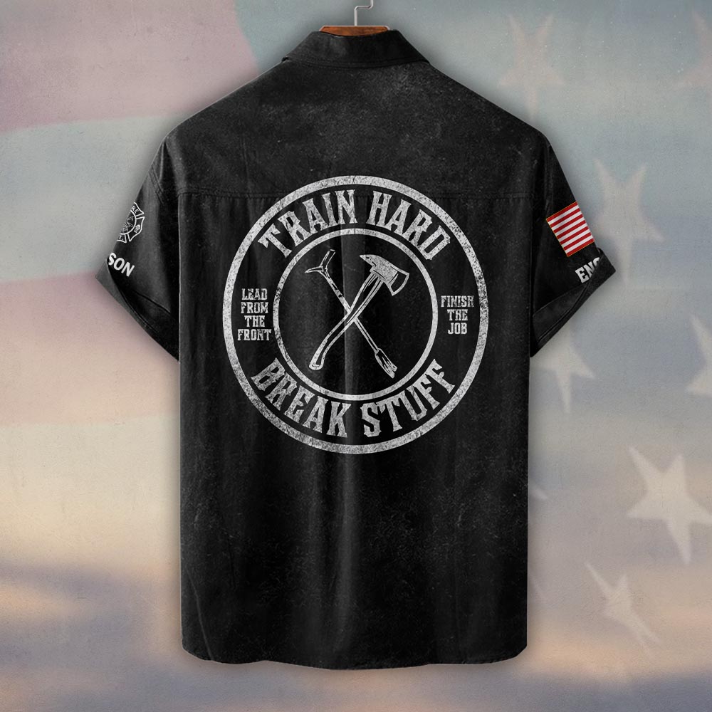 Custom Name & Text Train Hard And Break Stuff Firefighter #DQH0428 – Short Sleeve Button Shirt